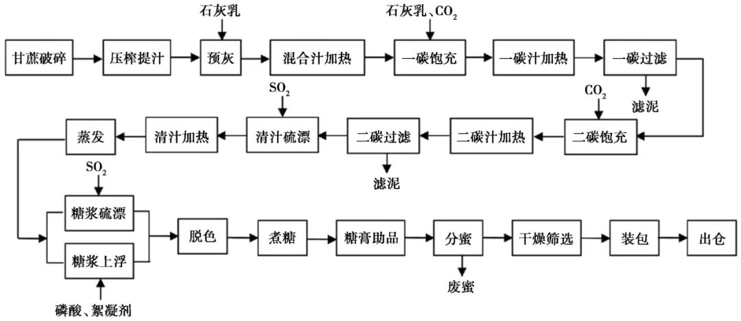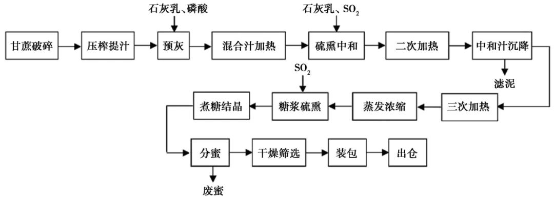亚硫酸法是用生石灰和SO2为澄清剂的蔗汁澄清方法。虽然该方法较碳酸法生产的蔗糖在色泽和浊度上有些差距,但工艺流程短,如图2所示。