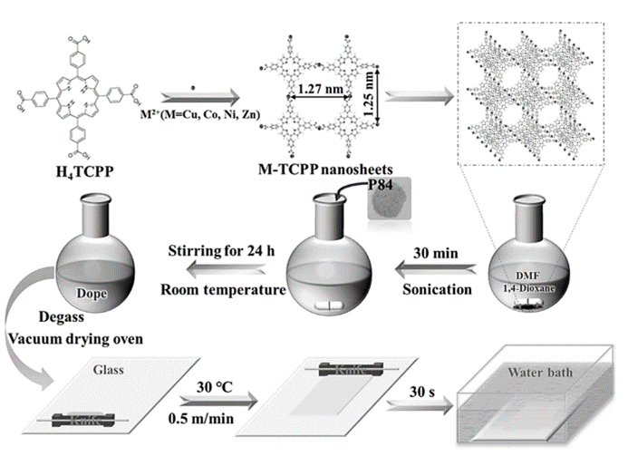 图1 MMMs的制造过程示意图,包括M-TCPP纳米片的制备、铸膜液的制备和通过刮刀进行制膜[11]1.2 薄层复合膜