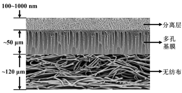TFC膜的分离层通过界面聚合制备,利用两种高反应活性单体或者预聚物在两个不相溶的溶剂界面处发生聚合反应,从而形成一层超薄分离层。常见的TFC膜主要由无纺布、多孔基膜以及分离层3部分组成,如图2所示。