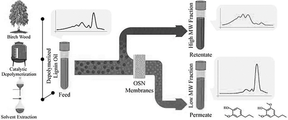 在化工领域,OSN膜在溶剂回收、溶质纯化等工艺中被广泛应用。Tim等[34]使用PMS600用于分离桦木分馏出的木质素油,分离甲醇和乙酸乙酯混合溶剂时,分离系数达到7.4,且透过液组分中的酚类纯度为88%,示意图如图3所示。