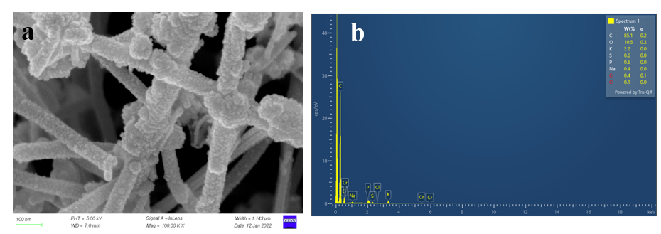 对PAR/C-MWCNT/GCE修饰电极和C-MWCNT/GCE修饰电极通过SEM和EDS进行了表征,以确定得到的复合纳米材料形态和元素组成。图1a是PAR/C-MWCNT纳米复合材料的SEM图。