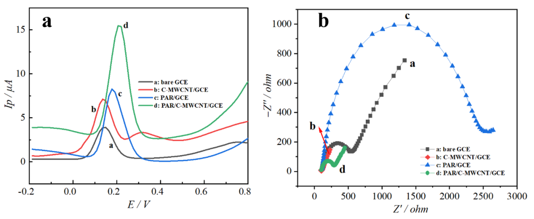 图2 a. 30 µmol/L Lut在不同电极上电流值的DPV图;b.不同电极的电化学EIS图2.3 PAR/C-MWCNT/GCE电极上的条件优化