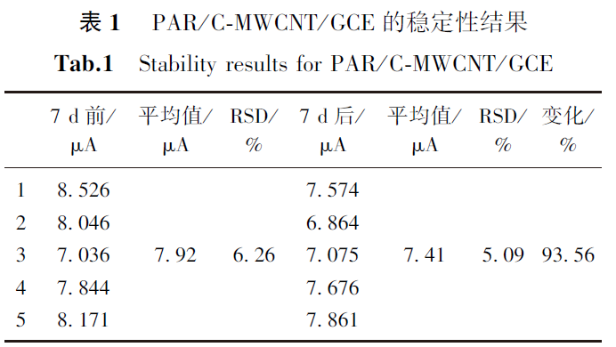 为了研究PAR/C-MWCNT/GCE的稳定性,在最佳实验条件下,将PAR/C-MWCNT/GCE电极置于20 μmol/LLut溶液中平行5次实验,结果见表1。