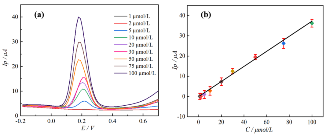 分别精密量取1、2、5、10、20、30、50、75、100 μL(0.01mol/L)的Lut至烧杯中,用pH为8.5的PBS缓冲溶液定容至10 mL,得其浓度分别为1、5、10、20、30、50、75、100 μmol/L。分别在优化的条件下测定其氧化电流值(图4)。