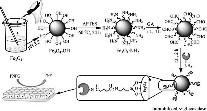 作为固定酶的新型载体,Fe3O4NPs具有独特的磁性能,比表面积大,与生物酶结合,既可以更好地从反应体系中分离和回收酶,不需要额外的离心过滤设备,又可以保护生物酶不受外界条件的干扰,提高催化活性,有效避免纳米粒子团聚现象的发生。通过对Fe3O4 NPs表面进行改性或包覆其他材料,可以增加其表面特定基团和结合位点的数量,再与酶蛋白中的氨基、羧基和羟基等基团形成共价连接。Cheng等[11]对Fe3O4 NPs表面进行氨基化修饰,以戊二醛为交联剂,与含有氨基的α-葡萄糖苷酶直接进行共价连接(图1),用于筛选虎仗提取物中的酶抑制剂。