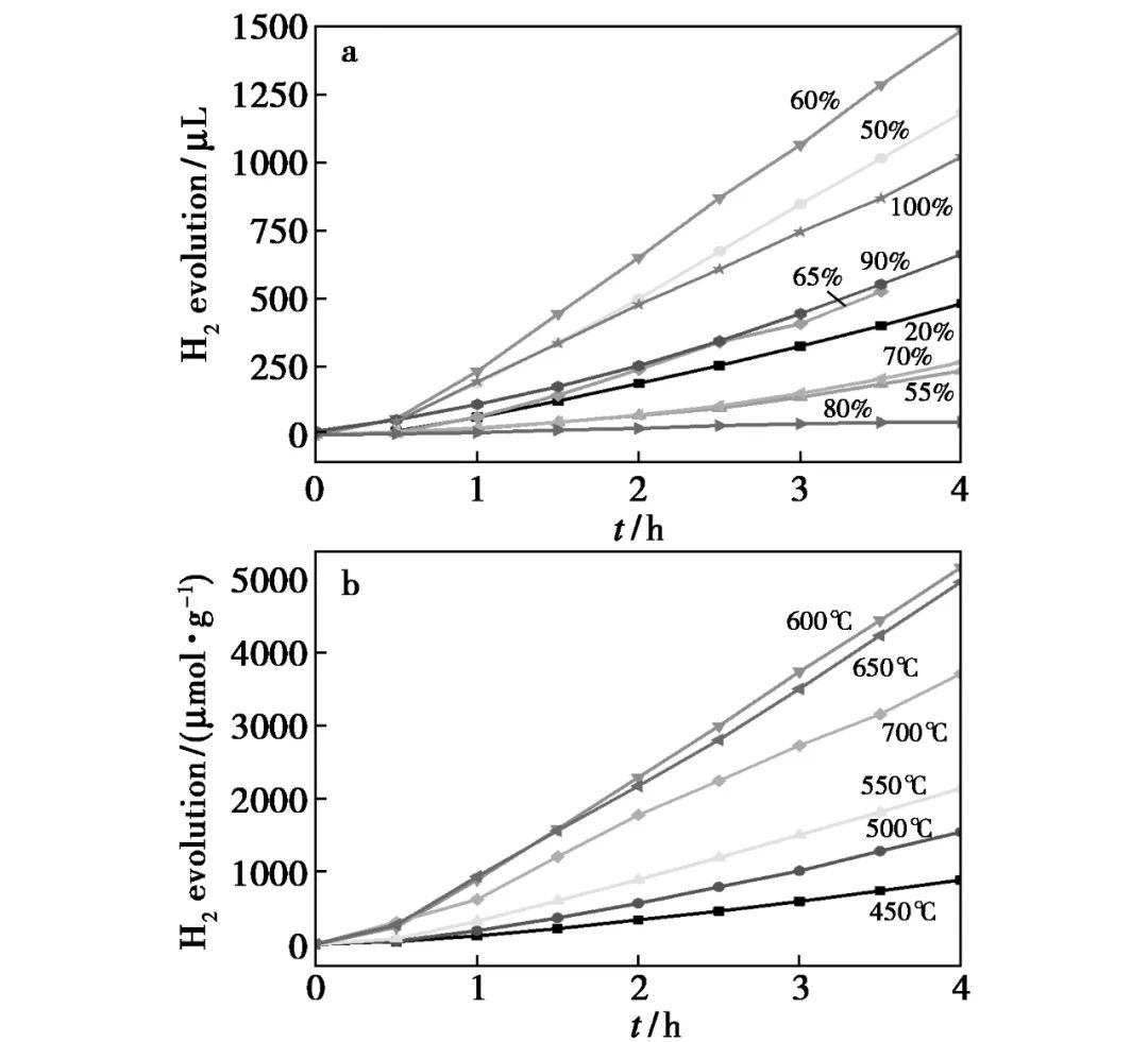 图1 a.X% Ni-NH2-MIL-125(Ti)为前驱体制备的TiO2-NiO复合材料的光催化产氢体积与时间的曲线(X=20~100,初始物质的量百分比);b.在450~700℃马弗炉煅烧制备的TiO2-NiO复合材料的光催化产氢速率与时间的曲线