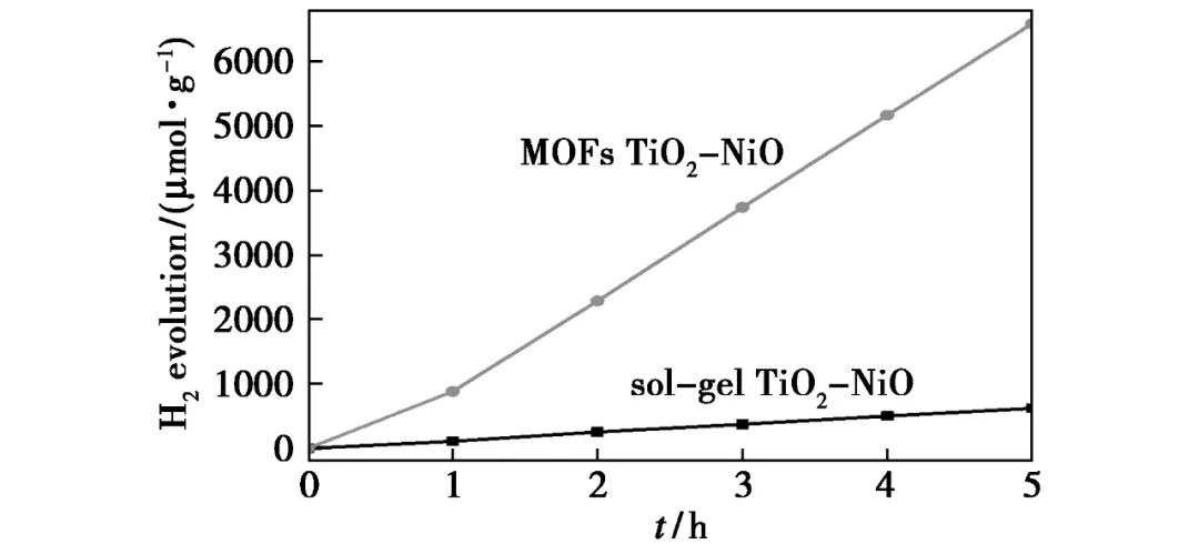 采用最优合成条件制备出TiO2-NiO催化剂,并测试了其与溶胶-凝胶法制备的TiO2-NiO在紫外-可见光照射下的光催化产氢性能。从图2可以看出,在相同实验条件下,利用MOFs作为反应前驱体得到的TiO2-NiO的光催化产氢速率为1396 μmol/(h·g),是传统溶胶-凝胶法的11倍(127.4 μmol/(h·g))。这表明利用MOFs作为反应前驱体制备TiO2-NiO光催化剂比传统的溶胶-凝胶法制备的TiO2-NiO有更高的光催化产氢活性。