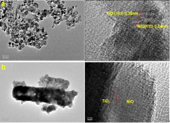 图3 MOFs法和溶胶-凝胶法制备的TiO2-NiO光催化剂的TEM(左)和HR-TEM图(右)