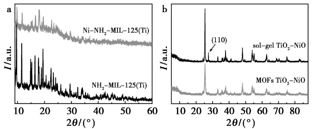 将得到的NH2-MIL-125(Ti)在Ni2+水溶液中进行预处理。然后过滤得到固体,用水和乙醇洗涤3次,并在60℃干燥。最后将得到的固体在600℃的马弗炉中煅烧2h。同时采用溶胶-凝胶法制备TiO2-NiO,并在上述相同条件下煅烧,镍的比例相同。
