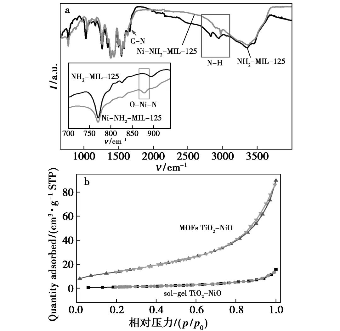 图6 a.煅烧前NH2-MIL-125(Ti)和NH2-MIL-125(Ti)的傅里叶变换红外光谱;b.采用MOFs法和溶胶-凝胶法制备的TiO2-NiO光催化剂在77 K时的N2吸附-脱附等温曲线