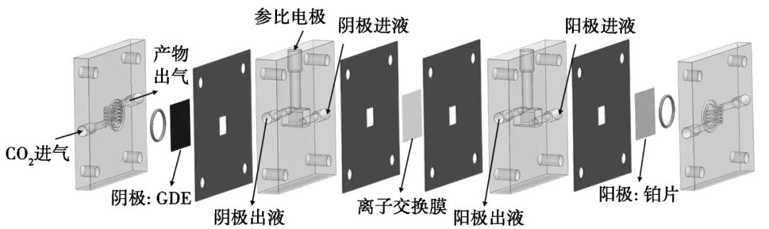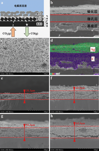 图4为阴极所用GDE的结构示意图,GDE由基底层、微孔层和催化层组成,其中基底层由碳纤维构成,主要用于支撑结构、传输电子,微孔层由碳粉和聚四氟乙烯(PTFE)混合得到,主要用于CO2气体及产物气体扩散,催化层由AgNFs催化剂构成,主要用于催化CO2还原反应。