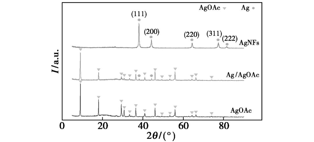 图2 AgOAc、Ag/AgOAc和AgNFs催化剂的XRD图