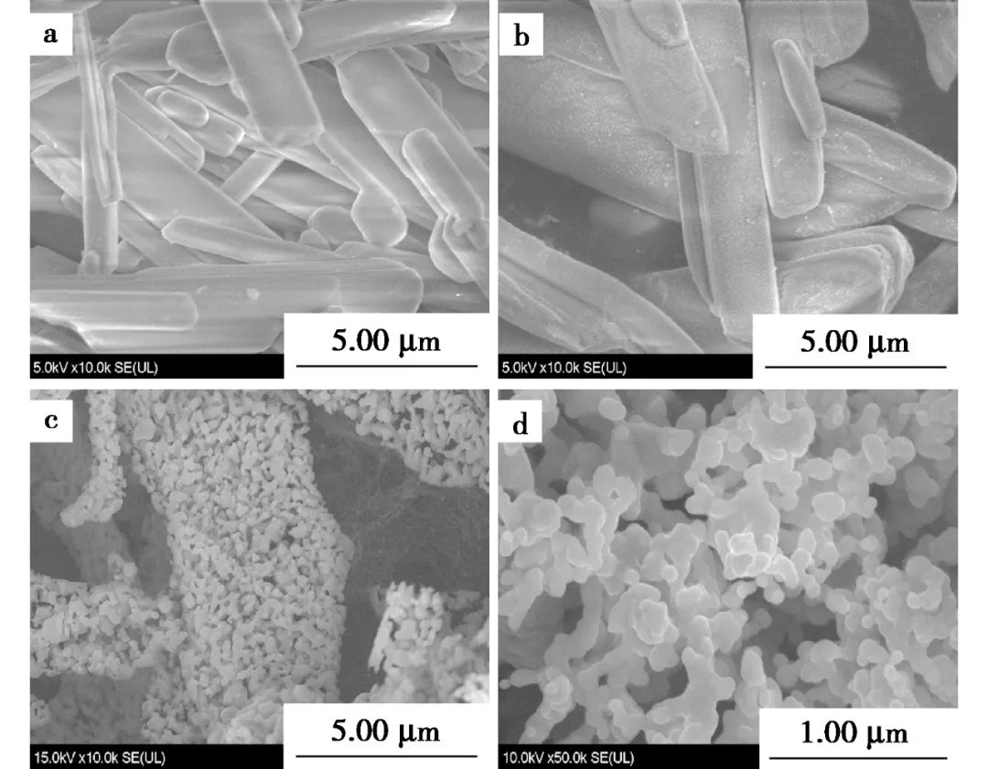 图3为AgOAc、Ag/AgOAc和AgNFs催化剂的SEM表征结果,比较图3a和图3b可以看出,Ag/AgOAc表面生成了很多较细的亮点,结合XRD图分析,可认为这些亮点是AgOAc还原后得到的Ag颗粒。电化学还原后得到的AgNFs(图3c)保持了前驱体的整体形貌,从图3d可以看出,AgNFs内部形成了纳米泡沫结构。