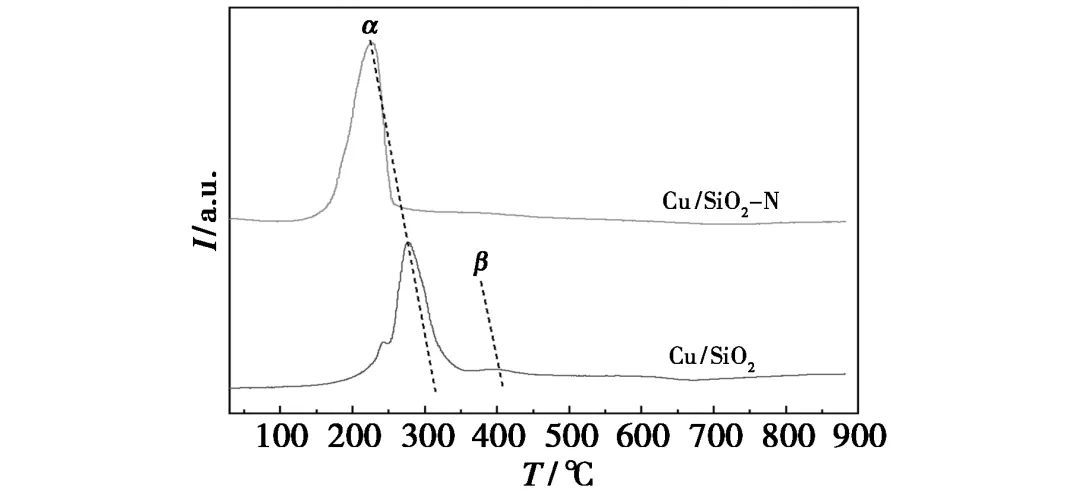 图3 新鲜Cu/SiO2和Cu/SiO2-N催化剂的H2-TPR图谱