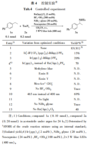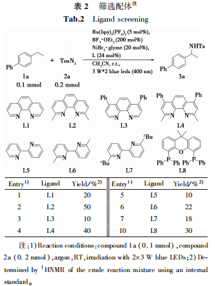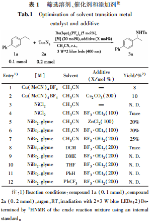 首先以六氟磷酸三联吡啶钌(Ru(bpy)3PF6)作为光催化剂,通过选用不同的金属催化剂和添加剂对苄位C—H键直接胺化反应进行了尝试,结果如表1所示。当选用四乙腈四氟硼酸铜作催化剂时,反应可以发生并以8%的产率得到目标产物,加入碱产率可以增加到10%,但未有明显提升。随后将催化剂更换为Ni,分别选用二氯化镍和二溴化镍乙二醇二甲醚配合物为催化剂,产率得到明显提升,特别是加入三氟化硼乙醚配合物为添加剂,产率可以提升到25%。在此条件下,同时对其他溶剂进行了尝试,在二氯甲烷(DCM)中反应可以发生,但仅检测到极少量的目标产物。其他溶剂,如四氢呋喃(THF)、苯(PhH)和三氟甲苯(PhCF3)中均未检测到目标产物。