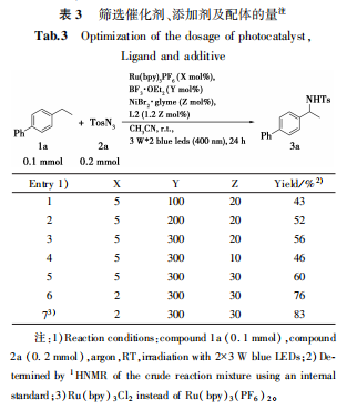 最后对反应中催化剂、添加剂及配体用量进行了调整,结果见表3。将光催化剂用量降低至2mol%,添加剂用量增加至300mol%,同时增加过渡金属催化剂及配体的用量产率可以达到76%,将光催化剂替换为Ru(bpy)3Cl2时产率可以达到83%。