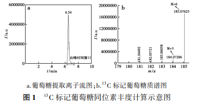 引用本文:范若宁,赵雅梦,王储尧,等. 一种基于高分辨液质联用仪的13C标记葡萄糖同位素丰度检测方法[J]. 化学试剂,2023,45(8):122-126DOI:10.13822/j.cnki.hxsj.2023.0212自上世纪80年代提出人类基因组计划以来,研究者们开启了对生物学、生物信息学等生命科学领域的研究探索。[U-13C6]葡萄糖作为示踪剂,可示踪糖酵解、三羧酸循环、谷氨酰胺代谢等与肿瘤发生密切相关的关键代谢通路,是目前应用最为广泛的稳定同位素试剂。[U-13C6]葡萄糖同位素丰度值是否准确对于同位素示踪及后续的代谢流量计算都会产生较大影响,因此,准确、稳定的测定葡萄糖的13C丰度值十分重要。