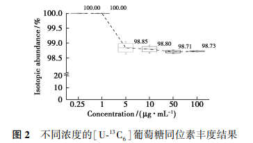 1、采用高分辨质谱仪结合液相色谱,通过考察检测适用条件、样品浓度、质谱扫描次数及流动相干扰影响等方面建立13C标记葡萄糖同位素丰度检测方法,并对不同丰度的13C标记葡萄糖样品进行丰度测定;2、该方法无需复杂的前处理过程,具有较好的准确性和稳定性,是一种具有潜力的同位素试剂质量控制方法。称取适量[U-13C6]葡萄糖,加入50%乙腈水溶液涡旋30s充分混匀,配制成浓度为1.0mg/mL的储备液。准确移取适量储备液,用50%乙腈水溶液稀释成250ng/mL以及1、5、10、50、100 μg/mL的工作标准溶液。储备液和工作标准溶液均保存于4℃。称取适量[1,2-13C2]葡萄糖,加入50%乙腈水溶液涡旋30s充分混匀,配制成浓度为1.0 mg/mL的储备液。不同13C丰度葡萄糖样品由[U-13C6]葡萄糖溶液与[1,2-13C2]葡萄糖溶液混合制成。准确移取75μL[1,2-13C2]葡萄糖储备液和25μL[U-13C6]葡萄糖储备液,用50%乙腈水溶液稀释成100μg/mL的样品溶液Ⅰ。准确移取50μL[1,2-13C2]葡萄糖储备液和50μL[U-13C6]葡萄糖储备液,用50%乙腈水溶液稀释成100μg/mL的样品溶液Ⅱ。准确移取25μL[1,2-13C2]葡萄糖储备液和75μL[U-13C6]葡萄糖储备液,用50%乙腈水溶液稀释成100μg/mL的样品溶液Ⅲ。储备液和样品溶液均保存于4℃。本文采用液相色谱-高分辨质谱联用法对[U-13C6]葡萄糖同位素丰度进行测定,图1a为葡萄糖的提取离子流图,提取出峰窗口叠加质谱图中的各同位素标记模式的峰强度(图1b)。2.2 高分辨质谱仪用于葡萄糖13C丰度计算的适用条件[U-13C6]葡萄糖样品中可能含有多种13C标记形式的化合物,如13C1-葡萄糖、13C2-葡萄糖等,因此在质谱ESI-条件下也会有相应[13C1C5H12O6-H]-、[13C2C4H12O6-H]-等一系列的分子离子峰,且各化合物自身天然同位素丰度也可能会造成干扰。2.3 [U-13C6]葡萄糖同位素丰度结果影响因素由于葡萄糖在质谱检测上存在离子化效率低等特点,当[U-13C6]葡萄糖样品浓度过低时,部分13C标记模式无法检出而造成同位素丰度结果存在偏差,同位素丰度结果如图2所示。应用本研究所建立的方法对3种不同丰度的13C标记葡萄糖样品Ⅰ、Ⅱ、Ⅲ进行13C丰度测量,对样品出峰时间窗口内所有质谱图进行叠加分析并扣除流动相背景,其检测结果如表5所示。
