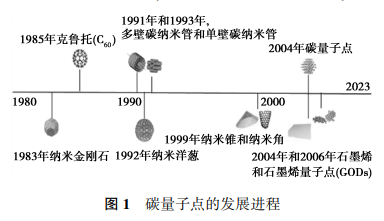 人们最早于1983年发现纳米金刚石,接连发现了碳纳米洋葱、纳米角和纳米锥等碳纳米晶体,最终在2004年,南卡罗莱纳大学的华裔化学家Xu Xiaoyou发现了碳量子点,发展进程如图1所示[1]。