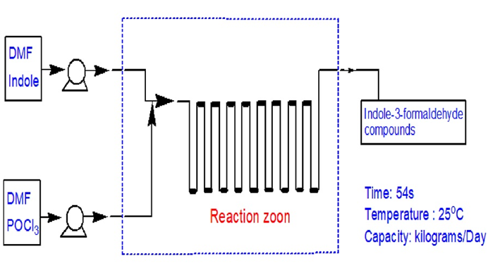 吲哚醛酮是重要的医药中间件体,广泛应用于具有生物活性的生化试剂合成。传统的合成方法采用反应釜间歇式生产,由于传质、传热的限制,导致反应时间长、能耗大、三废多,环境压力大。相反,微通道反应器具有极高的传质、传热效率,反应物混合充分,反应收率较高,反应温度易于控制,极大地缩短了反应时间,节约了能源,同时减少了溶剂的耗费,因此,以微通道反应器合成吲哚醛酮迎合了合成化学绿色环保要求,节能减排。