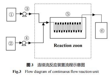 所使用的微通道系统如下图3所示。①和②为反应原料储存罐,①储存DMF和吲哚,②储存DMF和POCl3,原料准备好后由进料泵③和④输入到反应装置⑤进行两种物料混合并进行Vilsmeier-Hacck反应,反应完成后经导出管进入产品储存器⑥,混合物再进行淬灭和结晶提纯,产品经核磁表征,微通道反应器的总容积为6 × 6 = 36 mL。