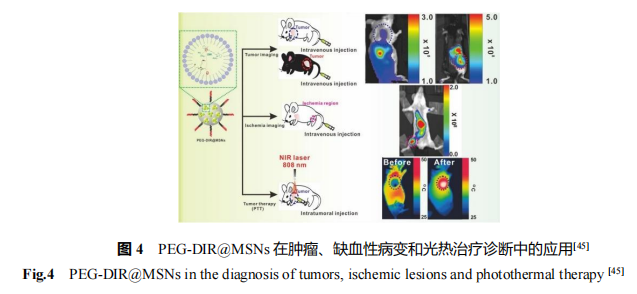 近年来,发光纳米材料及其复合材料的合成与应用成为生物成像诊断和癌症治疗的研究热点。在MSNs中掺杂荧光碳点或有机染料等造影剂以合成发光纳米材料,对癌细胞的可视化以及肿瘤精准治疗均具有重要意义。功能化修饰的MSNs递送载体可负载不同的造影剂并特异地靶向肿瘤组织,通过与活体荧光成像、近红外光谱技术和磁共振成像等技术的联合应用,实现药物的准确定位、癌症的早期诊断和精准治疗。
