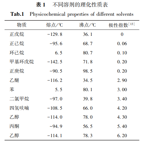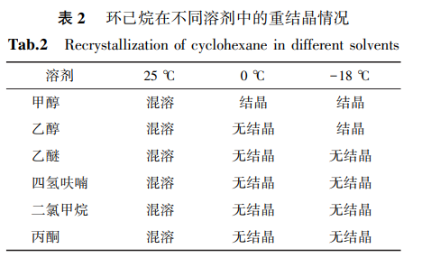 为了选择合适的环己烷重结晶溶剂,考察了环己烷在甲醇、乙醚、四氢呋喃、二氯甲烷、丙酮等溶剂中,在不同温度环境下的溶解度情况,相关实验现象见表2。