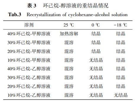 由于物质在溶剂中的溶解度随温度降低而减小,因此重结晶的温度是重要的实验参数。考察了环己烷在不同浓度甲醇或乙醇溶液中,不同温度环境下的溶解度情况,结果见表3。