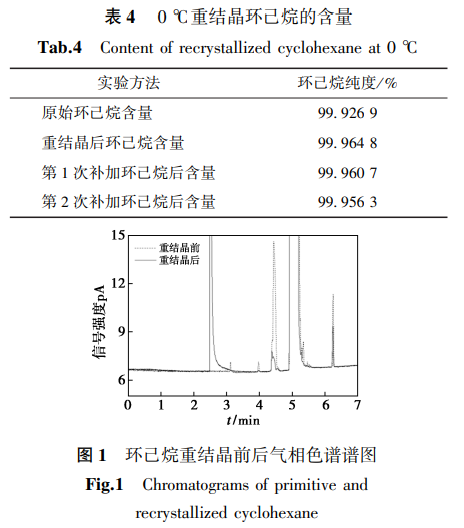 考察了30%的环己烷-甲醇溶液在0 ℃时重结晶的效果,以及重复利用甲醇溶液,环己烷纯度变化。结果见表4。通过气相色谱仪分析,测定环己烷含量和过滤后溶液中残余环己烷的含量。重结晶后杂质明显降低,结果见图1。