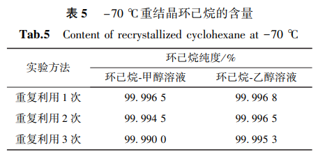 继续降低实验温度,考察30 %的环己烷-甲醇溶液在-70 ℃时重结晶的效果,以及重复利用醇溶液,环己烷纯度变化。结果见表5。