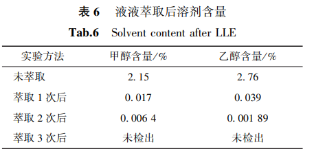 在重结晶的过程中,有一部分的甲醇/乙醇溶剂会包裹在环己烷晶体中,同时析出。甲醇和乙醇的水溶性都比较好,可以通过液液萃取去除。液液萃取重复3次,用气相色谱分析测定残余的溶剂含量。结果见表6。
