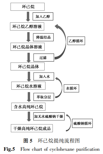 通过上述实验,可以将环己烷的纯化分为降温结晶,过滤提纯,萃取除醇,干燥脱水4个单元过程,操作流程图见图5,由图可知,工业过程中重结晶过程使用的乙醇,过滤过程使用的水都可以重复利用,本实验中进行了3次循环,但在实际应用中循环次数可根据环己烷纯度指标需要而定。
