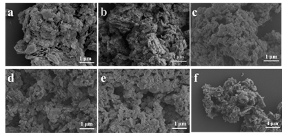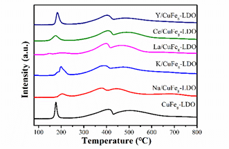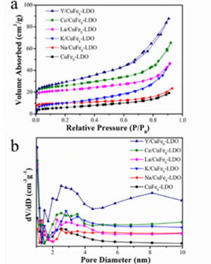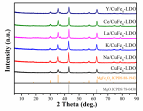 a. CuFe8-LDO, b. Na/CuFe8-LDO, c.K/CuFe8-LDO, d. La/CuFe8-LDO, e. Ce/CuFe8-LDO,f. Y/CuFe8-LDO