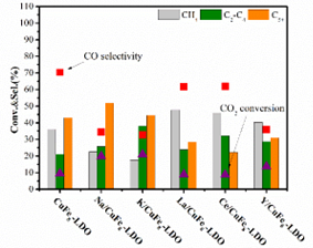CO2催化加氢合成高附加值的烃类化合物,不仅可以缓解化石燃料燃烧引起的大气CO2浓度攀升问题,还提供了一种合成洁净能源的新途径,具有广阔的应用前景。CO2加氢反应的难题之一在于高效催化剂的开发。铜铁基催化剂因其价格低廉、反应活性优异,被广泛应用于CO2加氢反应,但通过传统方法制备的铜铁基催化剂存在活性组分分布不均匀,易烧结团聚的问题。采用层状双金属氢氧化物(LDH)作为前驱体制备催化剂,可以实现活性组分的高度均匀分散,但其反应活性有待进一步提高。可以通过添加助剂调节产物分布,改善催化剂的还原或活化能力,提高催化剂活性。