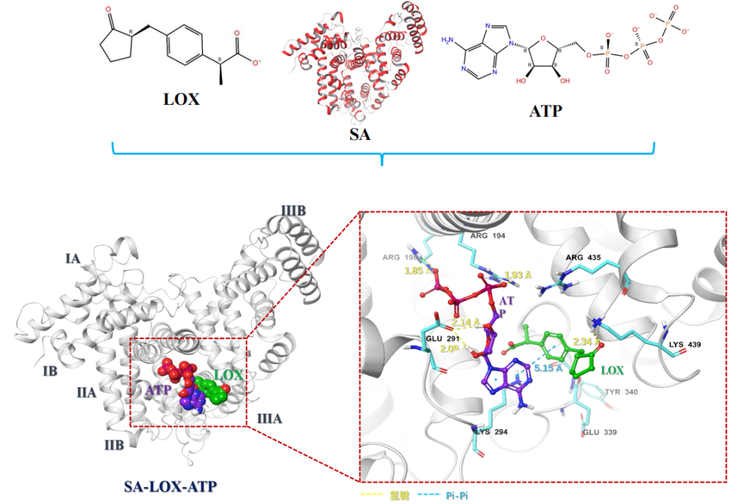 2.8 分子对接分析本研究通过多光谱分析出在洛索洛芬存在条件下三磷酸腺苷对蛋白荧光产生静态猝灭,两者靠氢键和范德华力相互作用;洛索洛芬和三磷酸腺苷可以被蛋白运输;蛋白-洛索洛芬-三磷酸腺苷体系的结合位置位于SA的亚螺旋域ⅢA;洛索洛芬和三磷酸腺苷之间有弱的正协同效应;洛索洛芬和三磷酸腺苷对蛋白的构象产生一定的影响,结合位点离酪氨酸更近;详细研究了锰、铜、镉、镍和铁对双药物分子与蛋白结合的影响;分子对接结果佐证了光谱实验的结论。总之,此工作不仅给后续进一步开展探究临床实践过程中应用联合用药对疾病进行治疗提供一定参考价值,而且为设计联合用药方案,实现提高临床疗效,降低药品毒性,延缓或避免抗药性的产生一定的启发。