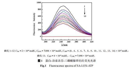 在10 mL容量瓶中依次加入1.0 mL(1.0 mol/L)NaCl、2.0 mL(0.05 mol/L)Tris-HCl缓冲溶液(pH 7.40)、1.0 mL(2.0 × 10-5 mol/L)SA、0.2 mL(3.549 × 10-3 mol/L)的洛索洛芬和不同体积的3.33 × 10-4 mol/L的三磷酸腺苷,用超纯水定容,分别在26.2、36.2、46.2 oC水浴锅内20 min后,通过多次扫描体系荧光光谱,找到最大激发波长在280 nm,在其最大激发波长下扫描体系的激发光谱,并记录最大发射波长下的数值(F)。上述容量瓶中未定容前,分别加入1 mL(1 × 10-2 mol/L)镁、钴、铁、锰和铬离子再定容,测定荧光光谱。按照上述方法配制溶液并扫描蛋白-洛索洛芬-三磷酸腺苷(SA-LOX-ATP)体系的紫外-可见吸收谱图。2.1 抑制荧光强度的类型