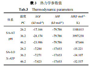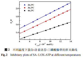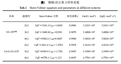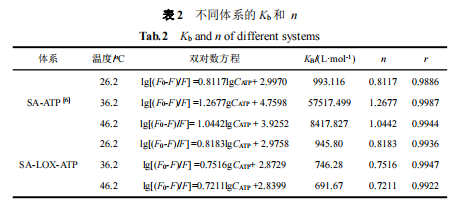 使用研究药物与蛋白相互作用的lg[(F0-F)/F] = lgKb + nlgCATP公式[7-9]计算SA与LOX和ATP双药物分子相互作用的表观结合常数KB与结合位点数n。表2列出了其线性方程、相关系数以及由斜率和截距计算出的KB和n值。