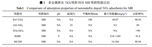 复合方法可以改变纯TiO2物质结构,复合后形成多孔结构,显著提高材料比表面积,并且通过各组分的协同作用有效提高吸附能力,性能比较详见表1。
