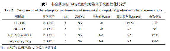 非金属掺杂TiO2吸附剂对水中金属污染物也有强大的吸附作用,4种铬吸附剂的吸附性能比较详见表2。