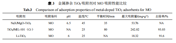 近年来许多研究结果表明,表面改性是制备高性能吸附剂的一种有效方法,3种不同掺杂策略的TiO2基吸附剂对MO染料的吸附性能比较详见表3。
