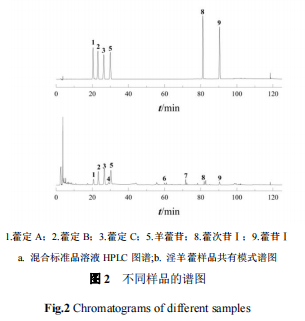 经多点校正后全谱峰匹配,得到24批淫羊藿样品的叠加图谱见图1,共标定9个共有峰。如图2所示,经与混合对照品溶液HPLC图谱比对,确认1号峰为朝藿定A、2号峰为朝藿定B、3号峰为朝藿定C、5号峰为淫羊藿苷、8号峰为淫羊藿次苷Ⅰ、9号峰为宝藿苷Ⅰ。