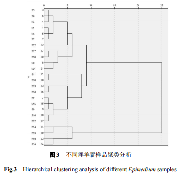使用SPSS 26.0版软件,以24批淫羊藿指纹图谱的9个共有峰峰面积为变量,采用组间平均连接法,以平方欧氏距离作为测量度,对24批药材采用系统聚类分析法进行模式识别分析,结果见图3。