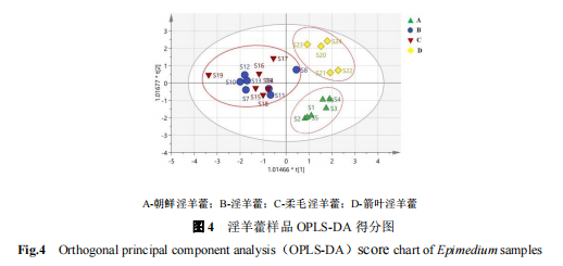 使用SIMCA 14.1统计软件对S1~S24淫羊藿样品的9个共有峰峰面积进行正交偏最小二乘法分析,从而揭示不同品种淫羊藿之间的主要差异成分(图4)。