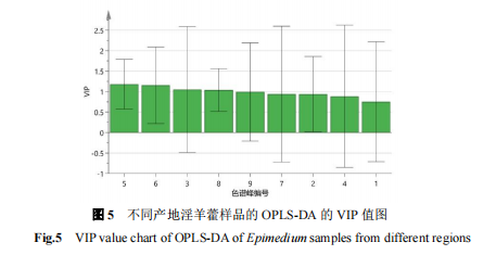 如图5所示,变量重要性指标(Variable Importance in Projection,VIP)值大于1的成分共有5个,表明这5类成分为不同品种淫羊藿之间的主要差异性成分。