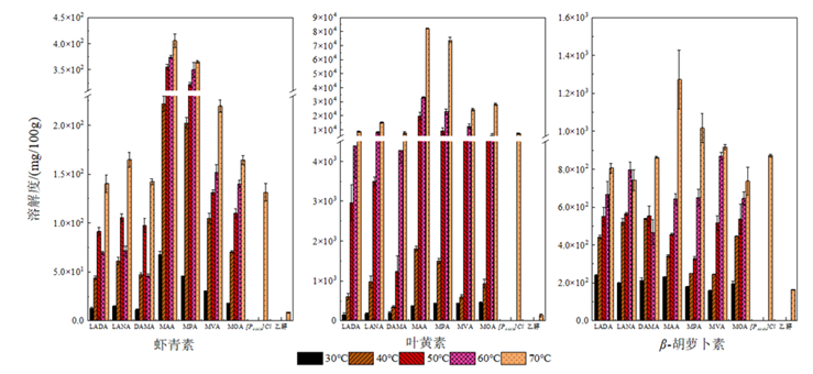 温度为70 ℃时,虾青素在MAA的溶解度最高为405.94 mg/100g,而30 ℃下仅为67.92 mg/100g;叶黄素和β-胡萝卜素也呈现相似的规律。