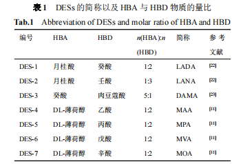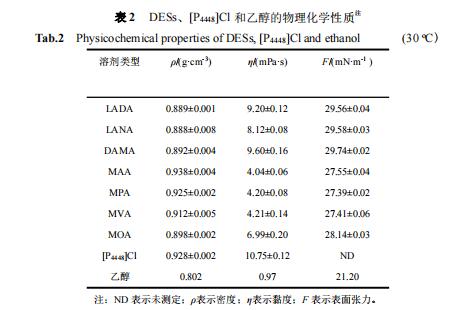 DESs各组分的相互作用和结构是影响DESs理化性质的最重要因素[26],也会影响溶质与DESs之间的作用(π-π键、离子键、氢键)[16]。因此,本文首先比较30 ℃时7种DESs、[P4448]Cl和乙醇的理化性质(密度、黏度、极性和表面张力),结果如表2所示。