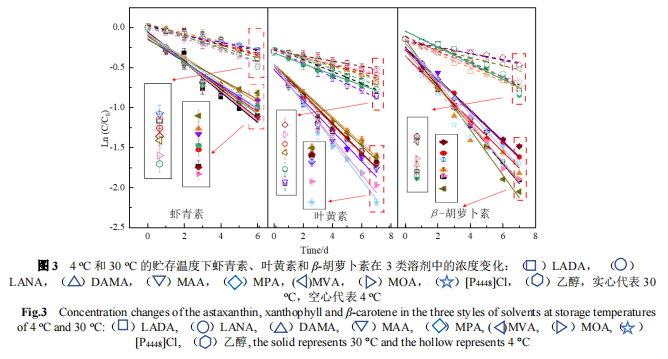如图3所示,贮存期间虾青素、叶黄素和β-胡萝卜素3种类胡萝卜素在不同溶剂中的浓度随着时间推移而降低。