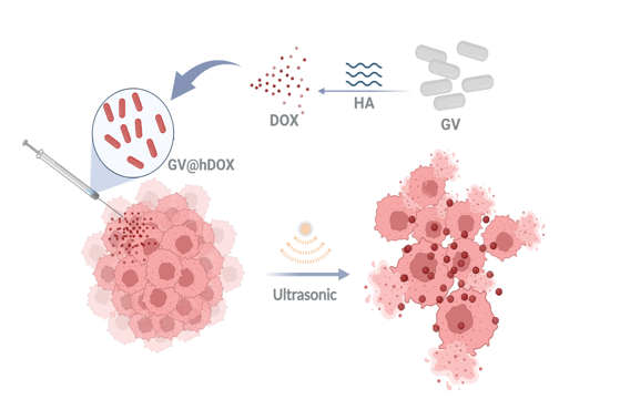 1.设计了一种新型的纳米药物递送系统,其中以气囊蛋白(Gas vesicles,GV)作为载体,透明质酸(Hyaluronic acid,HA)用于靶向,并携带阿霉素 (Doxorubicin,DOX)作为药物;