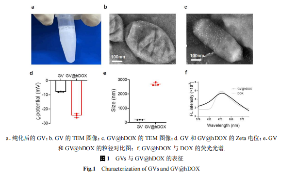 将3.37 mg EDC和2.00 mg NHS加入10 mg HA溶液中,冰浴搅拌2 h后滴加1 mL(2 mg/mL)DOX。将反应混合物在4 ℃下继续搅拌24 h,获得HA-DOX。将3.37 mg EDC和2.00 mg NHS加入HA-DOX溶液中,然后在冰浴中搅拌2 h。加入1 mL(OD500=2.0)分散于PBS中的GV,4 ℃下搅拌24 h,所得混合物加入超滤管,1800 r离心5 min,去除游离EDC、NHS和HA,得到GV@hDOX并在4 ℃保存。