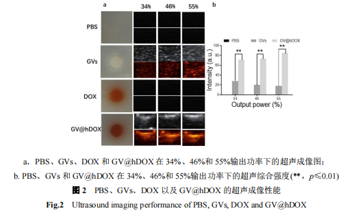 为了研究HA-DOX在GV表面接枝对其超声成像能力的影响,在34 %、46%和55%的超声功率下,对PBS、GV、HA-DOX和GV@hDOX进行超声成像(图2)。